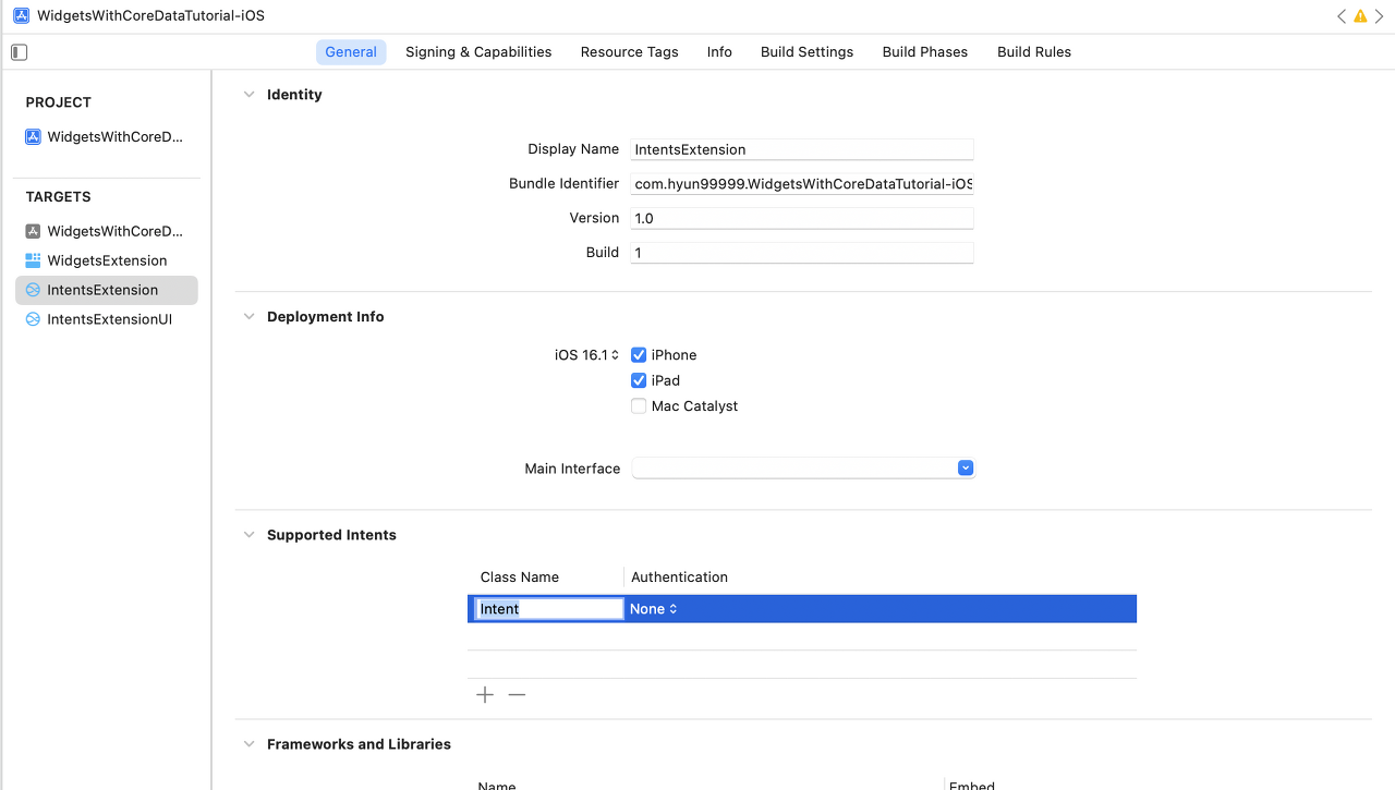 SelectMyCardIntent라는 클래스 이름으로 참조할 수 있습니다.(Attribute Inspector 의 Custom Class 필드에서 확인할 수 있습니다.) - 새로운 target 속성의 General tab 에서 Supported Intents 섹션에 entry 를 추가하고 Class Name 를 추가해줍니다.